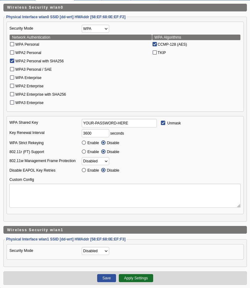 By default, the WiFi is unprotected on DD-WRT. You need to set Security Mode to WPA. Set the algorithm to CCMP-238 (AES) and enter a strong password in the WPA Shared Key field.
