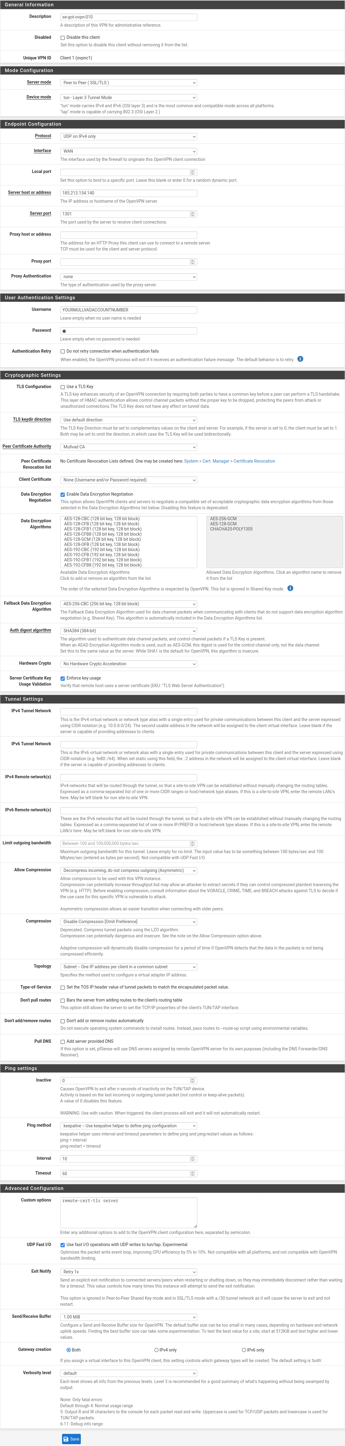 - Set Device mode to: tun Layer 3 Tunnel Mode
